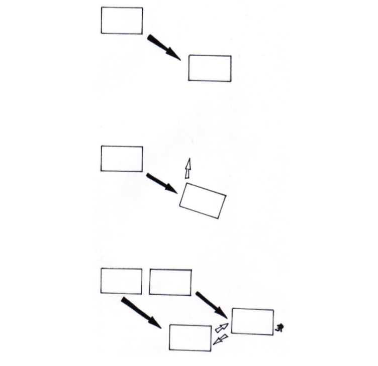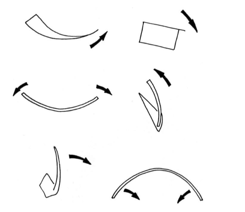 En haut la structure se déplace spatialement vers l’avant et le bas. Au centre la structure se déplace spatialement vers l’avant et le bas mais sa partie postérieure monte relativement. En bas les deux structures se déplacent spatialement vers l’avant et le bas. La seconde (à droite) avance davantage que la première mais descend moins