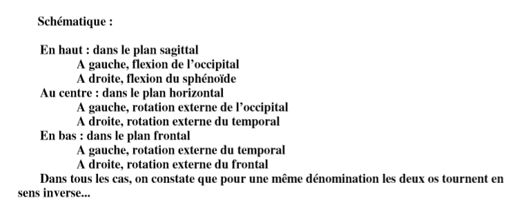 Enfin, lors d’une même phase de « flexion-rotation externe » le temporal s’incline sur sa face externe, alors que le maxillaire, ou encore le frontal, le font sur leur face interne.